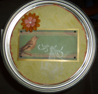 Altering items and giving them new lives, is very exciting for me. Recently, I joined an Easter Paint can swap on a messageboard that I belong to. The rules were simple: Design and alter a paint can that your swap partner would love, and fill it with all sorts of crafting/scrapbooking/personal items that your partner would love. I went to Michael's craft store and they had a great line of scrapbooking paper, stamps and other embellishments. On the lid I distressed a round fitted piece of paper, attached a bird tag, added prima (paper) flowers, and a brad. Then I took out one of the latest rubber stamps I bought that had a chandelier on it. I used a silver stamp pad and stamped the lid. The paper was attached using double sided tape. The hardest part of the entire can was to cut the paper in the right places so that the handle wouldn't be hard to reattach and for a more finished "Look." I contacted each of my partners, and although this was supposed to be an Easter "looking" can, they wanted a can that could be used year round.I enjoyed making them so much that I made one for myself in the same papers.